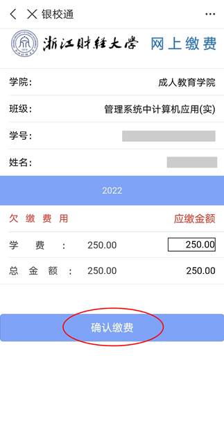 3.员工请在学号栏输入考核课程代码+准考证号(如某同学报会计专科毕业设计,代码为:10217加上本人的准考证号12位,共需填写17位号码。如需考两门或以上,不同课程要分别缴款)在姓名栏内输入姓名,点击“查询”,核对个人信息和缴费信息,点击“确认缴费”进行缴纳。待来校报到时,凭缴费信息换取正式学费收据。