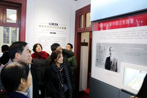 随后,大家来到西湖边参观杭州“五四宪法”历史资料陈列馆,感受宪法的神圣与庄严。陈列馆里分为序厅、复原陈列和主题陈列三大展区,丰富的视频图片和文献实物资料,生动的原景重现,复苏了历史,激活了记忆,党员教工们身临其境地感受了新中国第一部宪法的孕育过程:60多年前,毛泽东主席率领宪法起草小组成员,在这里度过了77个日夜,起草了我国宪法草案初稿,史称“西湖稿”,为1954年宪法的正式诞生奠定了重要基础。