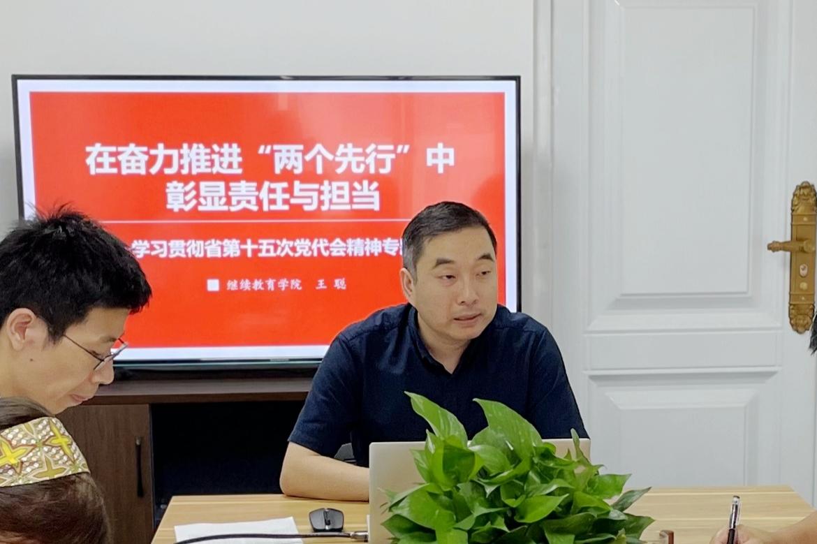 会上,公司党总支书记王聪首先向大家讲授了《在奋力推进“两个先行”中彰显责任与担当》专题党课。他从新使命、新跨越、新征程、新目标、新任务、新要求等六个方面,深入阐释了省第十五次党代会精神实质,并希望支部党员要在绝对忠诚中汲取感恩奋进的力量,在“两个先行”中坚定转型发展的决心,在践行初心中树牢以人为本的理念,在变革重塑中提升办学治院的能力,在“唯实惟先”中掀起奋进争先的热潮,在履职尽责中严守清正廉洁的底线,努力在推进“两个先行”中彰显浙财继教人的责任与担当,推动公司继续教育事业发展再上新台阶。