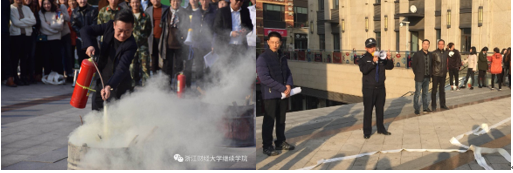 此次消防安全演练活动含紧急疏散、消防安全知识讲解及灭火演示三项内容。下午2时30分左右,下沙分院保卫处模拟起火并按下手动报警装置,消控中心确认“火情”后拉响楼层声光报警器。员工在楼层疏散老师的指引下快速有序地分批向下疏散,并在较短时间内安全地撤离到了集合点。白杨消防中队董永汇指导员为全体师生讲解消防器材的使用及消防安全知识,教职工和员工代表进行了现场灭火演示。余铁城警官对于此次消防演习进行了简要点评。