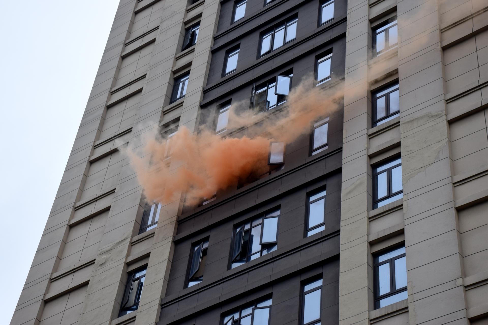 下午3点,员工公寓楼模拟起火,顿时烟雾从窗口喷涌而出。随着消防报警声的响起,各班主任、楼层指挥人员迅速到班到岗,沉着冷静地指挥员工用湿毛巾捂住口、鼻,尽量将身体放低,紧急撤离宿舍楼,安全、快速、有序地疏散到指定地点。