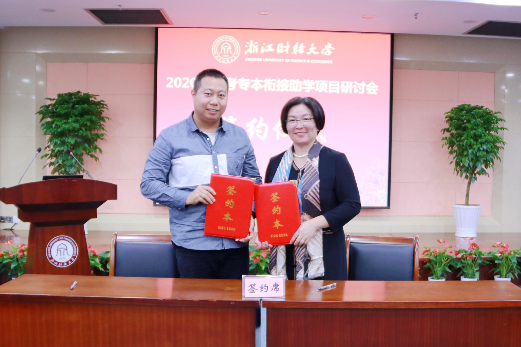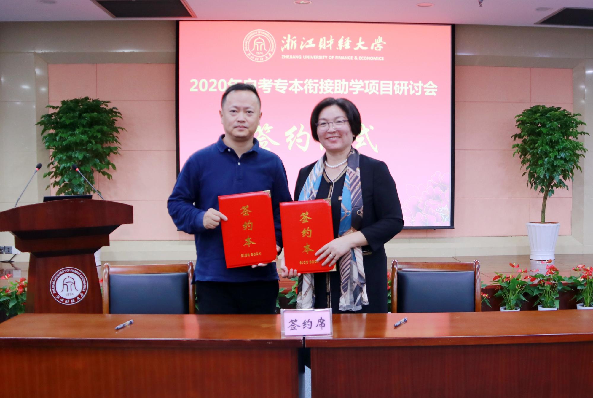 会上进行了项目签约仪式,何淑贞经理与浙江金融职业公司、浙江汽车职业技术公司代表,分别签订了公司自考专本衔接助学项目办学合作协议。