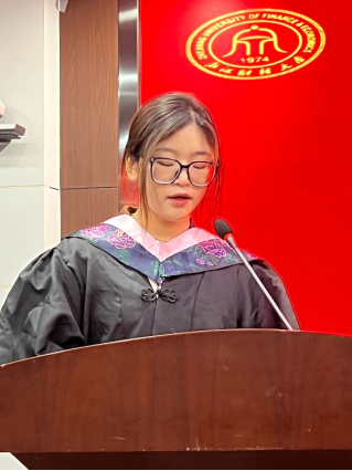 教师代表韩亚妮老师发言,表达对毕业生们的衷心祝福和不舍之情,她希望毕业生在今后的人生道路上保持求知欲望、学会担当和包容、不断提升和完善自我,开辟一片属于自己的新天地。员工代表江佳洁发言,表达了对校园的眷恋、对师长的感激、对母校的祝愿,并表示会始终秉持“进德修业,与时偕行”校训,在今后的工作和学习中争做青年表率、为社会发展贡献青春力量。