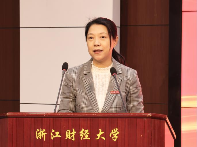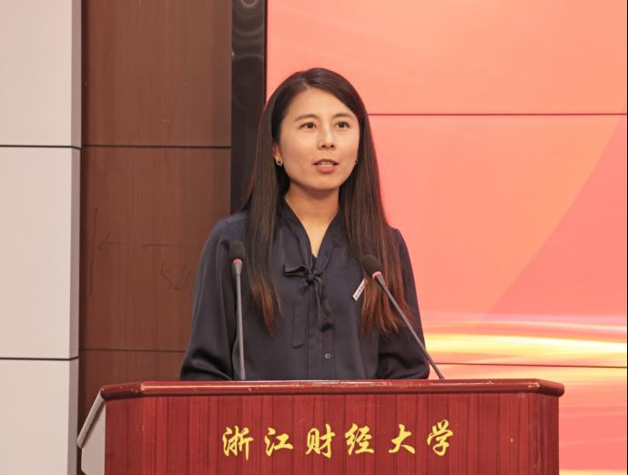 外国语公司副教授张迅作为教师代表发言。她欢迎新生加入浙财大家庭,并勉励同学们强决心、树信心、立恒心,在做中学,在学中悟,珍惜时光、坚持不懈,通过付出努力和汗水,收获学习成果。