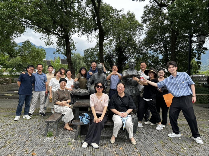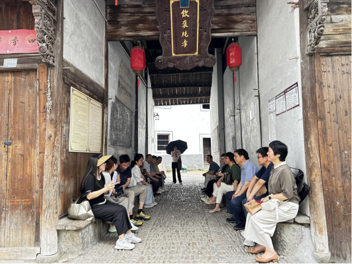 之后,大家步入龙门古镇。古镇地处秀丽的富春江南岸,远山如黛、环境优美,是三国东吴大帝孙权的故里。孙权后裔在此地世代传承,形成了深厚的文化积淀和浓郁的宗族氛围。穿梭于鳞次栉比的街道,仰看矮矮的屋檐,触摸斑驳的墙体,感受时光的悠远。宏大的明清古建筑群,各式祠堂、厅堂、民宅、古塔、石桥、牌楼,让大家恍若隔世;不时穿街而过的小电驴,隐于小巷深处的民宿,绵延不断的商铺,又带给大家现世的繁华。在古朴的廊檐下稍作休憩,在老街的店铺里买付球拍,在转角小亭下留个古风的影,这秀丽风光和人文景观,还有中华优秀传统文化的独特魅力,让大家精神和身体都得到了彻底的放松。