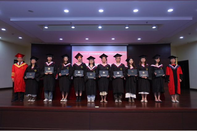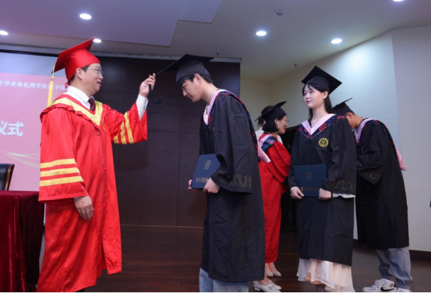 学位授予仪式上,董进才和林凡为获得学士学位的毕业生逐一拨正流苏,颁发学位证书,并合影留念。