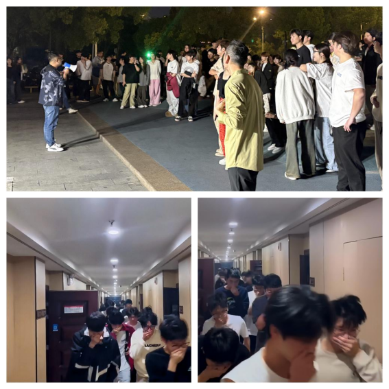 18点30分,演习正式拉开帷幕。模拟火情设定为公寓某宿舍因电器短路引发火灾,浓烟迅速沿楼道扩散。在生活老师的引导下员工按预定路线撤离,弯腰低姿、用湿毛巾捂住口鼻,沿绿色应急指示灯从消防通道快速疏散。整个过程井然有序,参演师生全部安全抵达操场集合点,各班班主任逐一清点人数并上报总指挥,实现“零遗漏、零伤亡”目标。