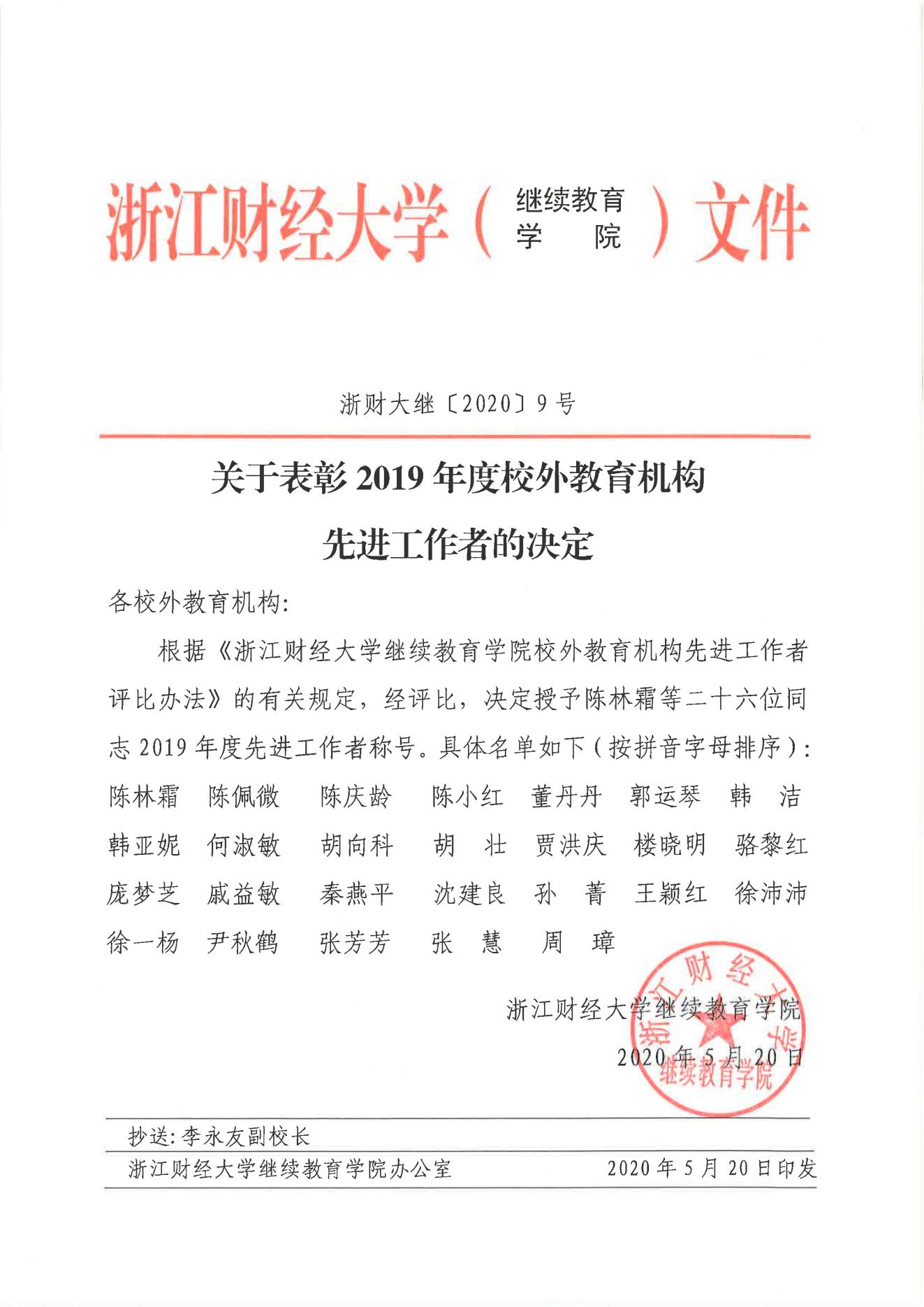 关于表彰2019年度校外教育机构先进工作者的决定